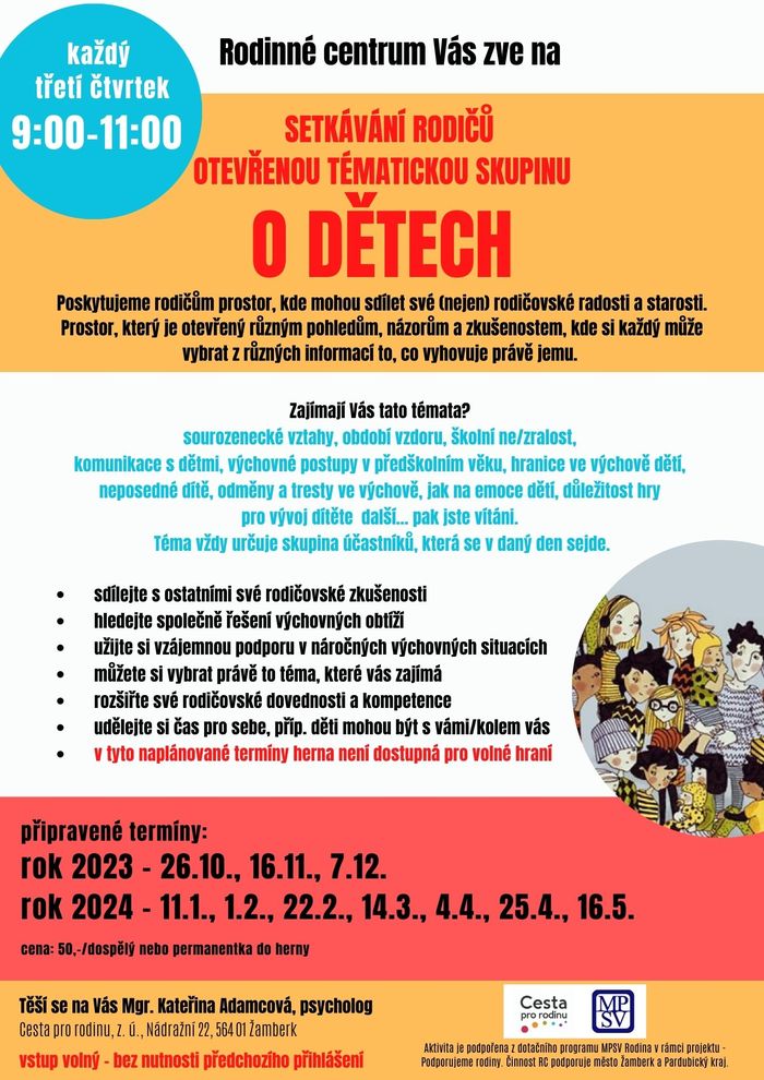 Rodinné centrum - 608 621 301 DS Maceška/chůvy - 730 870 435 Lucie Malá - 603 813 646 Klára Brejtrová - 774 174 287 |