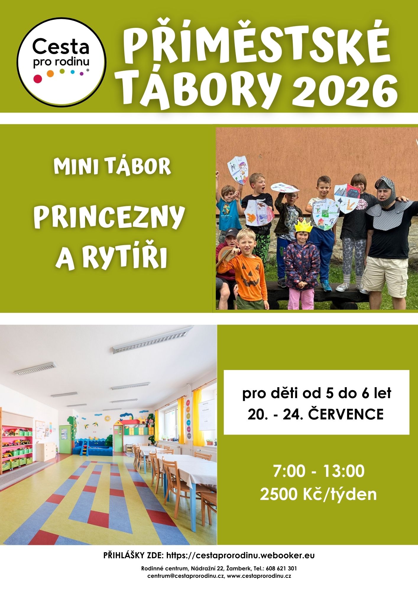 Přijetí dítěte na tábor a jeho závazné přihlášení je podmíněno vyplněním přihlášky v elektronickém rezervačním systému ZDE: cestaprorodinu.webooker.eu, úhradou ceny tábora a volnou kapacitou.