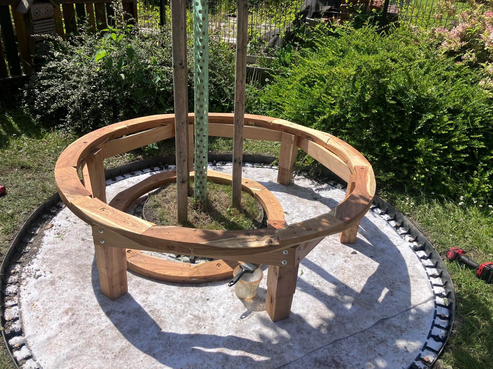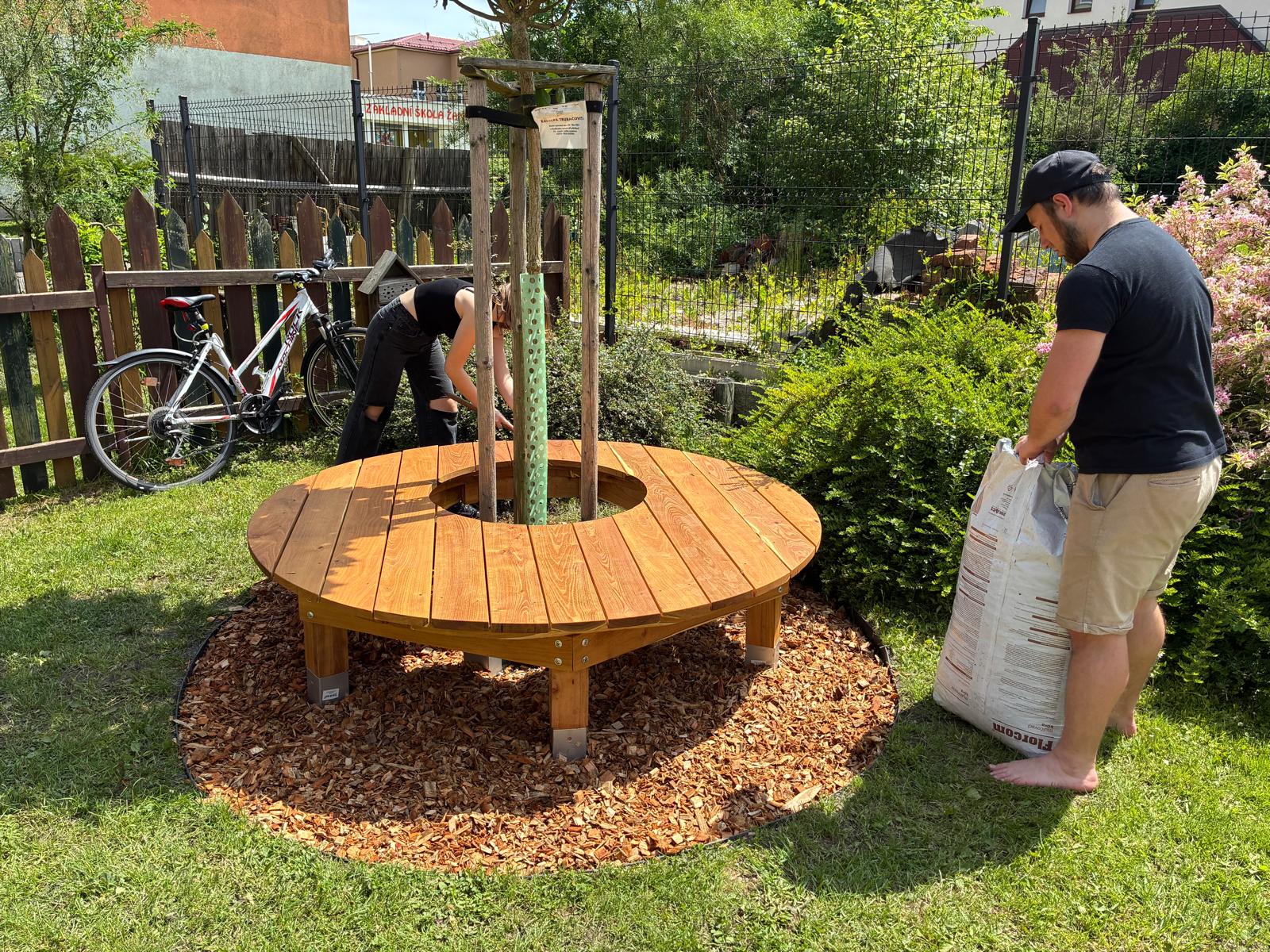Rozdělili se tedy na dvě skupinky a první z nich se pustila do vykopávání starého keře, likvidace velkého množství větví a kmenů z nedávného prořezu a vytahování pařezů po odstraněných tújích. Po vyčištění a uklizení potřebného prostoru od pařezů se pustili do usazování dlaždic a dosypání kačírku. Jednalo se o fyzicky velmi náročnou práci, ale společnými silami se vše podařilo.